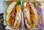 맥스파이시 상하이버거와 비교하면 적양파와 스리라차 소스가 추가되었으며, 번이 참깨번에서 콘밀번으로 바뀌었어요.