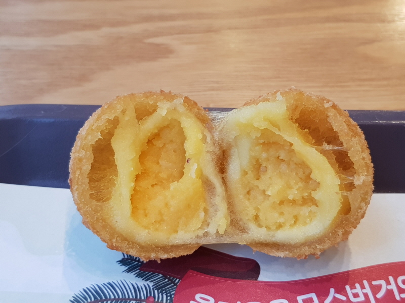 깨무는 순간 튀김옷이 바삭거리고, 씹으면서 떡인지 치즈인지는 정확히 모르겠지만 쫄깃한 식감이 느껴지며, 고구마 무스의 단맛까지 쫙 느껴지거든요.