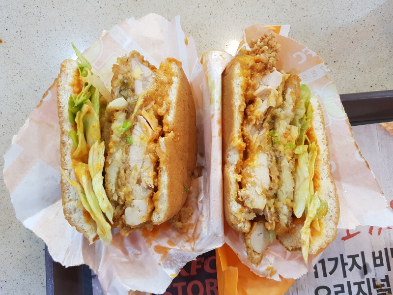 한국인이 좋아하는 쫄깃한 닭다리살 패티에 매콤한 맛이 나고, 양상추나 야채도 적당히 들어있거든요.