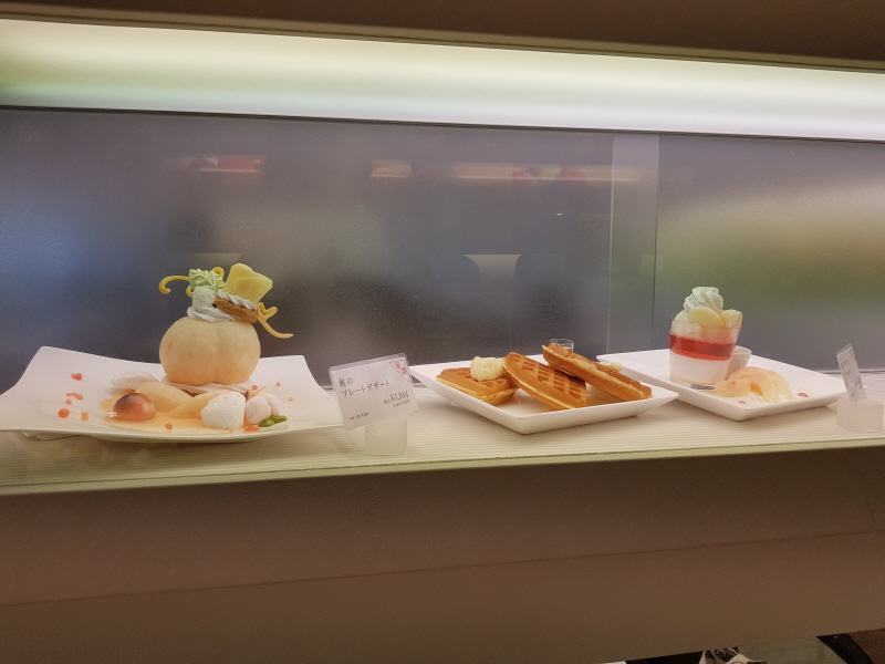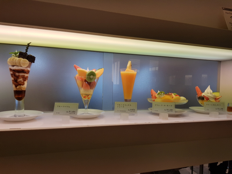 엘리베이터에서 내리면 타카노 후르츠팔러에서 판매하는 제품 모형들이 진열되어 있어요.