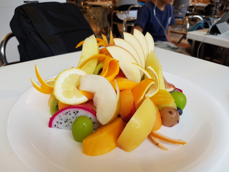 다양한 과일을 한 접시에 예쁘게 장식해서 제공되는데, 사과, 멜론, 복숭아, 자몽, 포멜로, 청포도, 적포도, 용과, 오렌지, 배, 자두, 키위, 블루베리, 파인애플 등등 다양했어요.