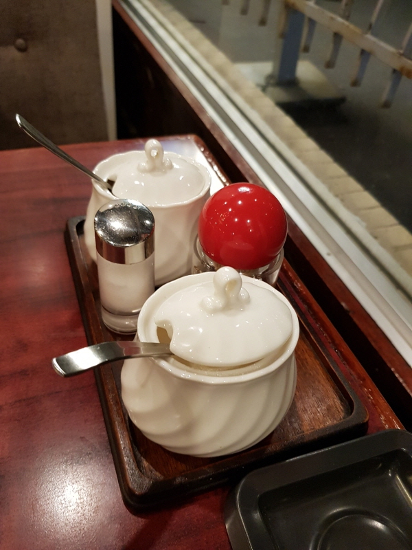 테이블 위에는 커피에 넣어 먹을 설탕과 크림이 올려져있어요.