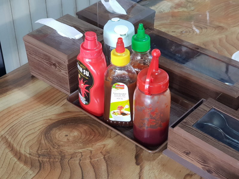 테이블 위에는 해선장과 스리라차 소스, 느억맘 등 쌀국수에 뿌려먹거나 다른 요리를 찍어먹을 소스가 놓여져있어요.