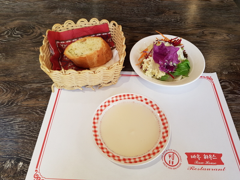 제일 먼저 크림스프와 마늘빵 한 조각, 샐러드가 나와요.