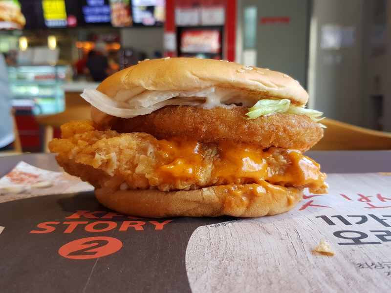 새우패티 혹은 새우와 고기패티가 같이 들어간 조합은 맥도날드와 버거킹 등에서 인기리에 팔리고 있지만, 새우와 치킨의 조합은 거의 못 봤어요.