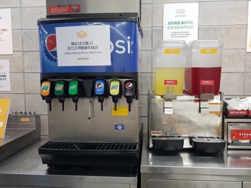 레몬 베이스와 체리 베이스가 있어서 콜라+체리베이스로 체리콕 혹은 사이다+레몬베이스로 레몬에이드를 자체체작해 마실 수도 있어요.