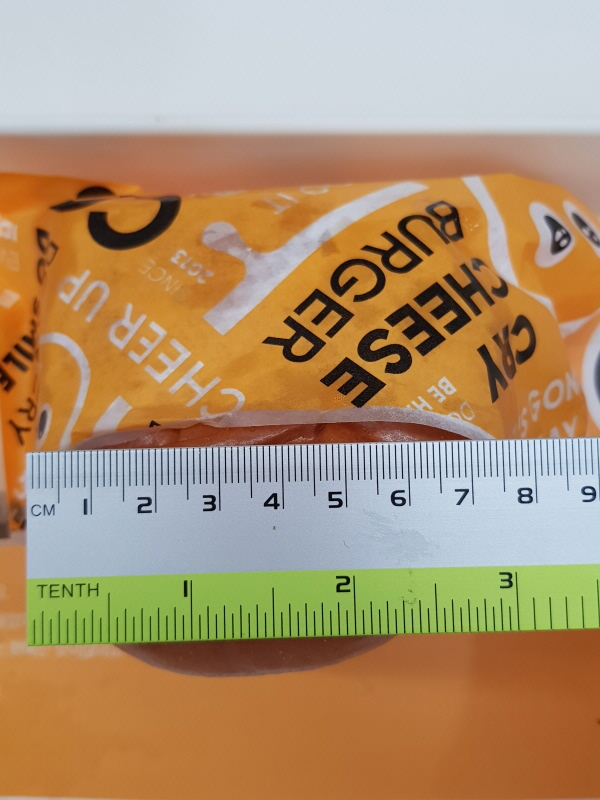 더블치즈버거 크기는 지름 8cm, 높이 8.5cm 입니다.