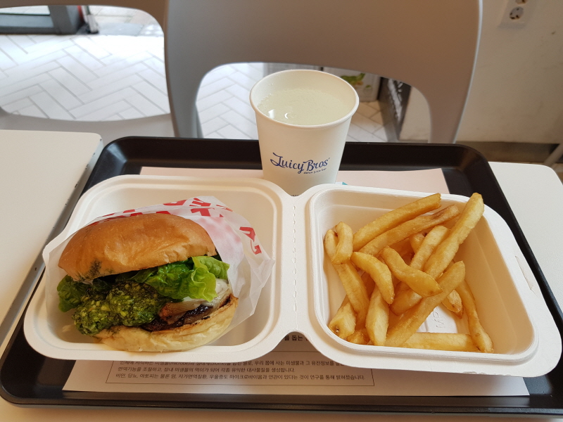 회사 측의 설명에 따르면 힘난다버거의 소고기 패티는 힘난다 바이오 식품연구소에서 개발한 사이언스패티로, 소화와 영양소 흡수를 돕는 신바이오틱스가 함유되어있다고 하는데, 진짜인지 아닌지는 모르겠어요.