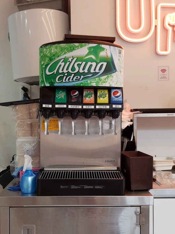 포장시에는 콜라 혹은 사이다 355ml 가 제공되고, 매장에서는 음료 디스펜서에서 직접 뽑아먹으면 됩니다.