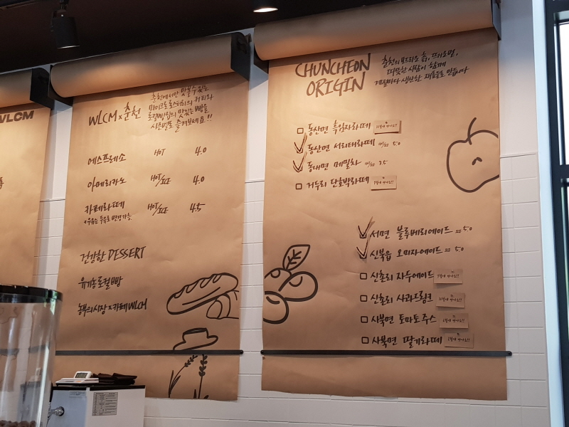 그래서 메뉴 이름도 동산면 서리태라떼, 신촌리 자두에이드 등으로 되어있고, 제철 시즌에만 판매하는 메뉴들이 많아요.