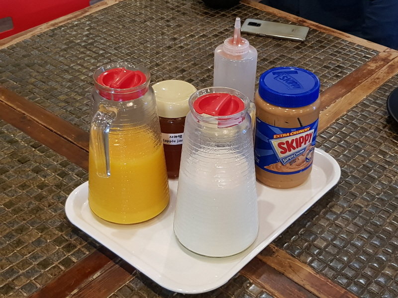 시리얼과 토스트가 있으며, 딸기잼, 사과잼, 땅콩버터, 우유, 커피, 오렌지주스 등을 자유롭게 가져가 먹으면 됩니다.