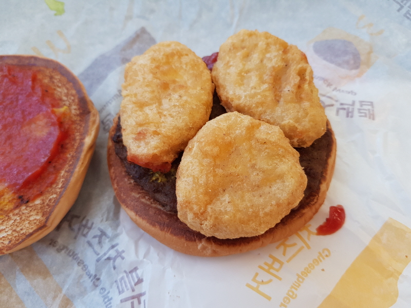 먼저 패티 위에 너겟을 올려줍니다.