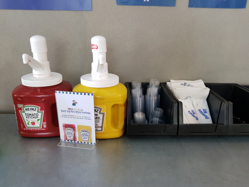 케첩과 머스터드는 플라스틱 용기에 직접 펌핑해서 가져가면 됩니다.