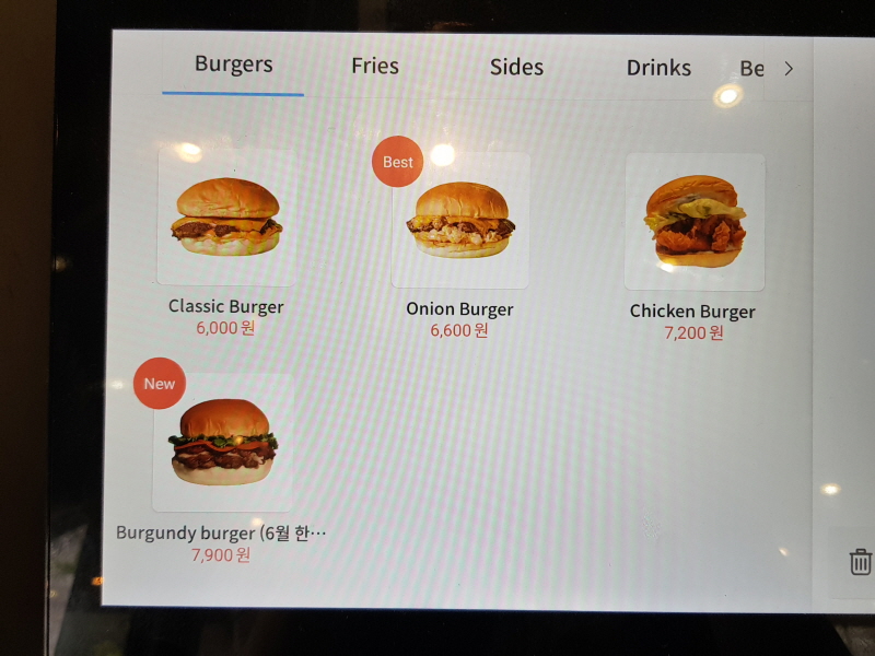 버거는 딱 4가지로, 클래식 / 어니언 / 치킨버거 와 이달의 버거입니다.