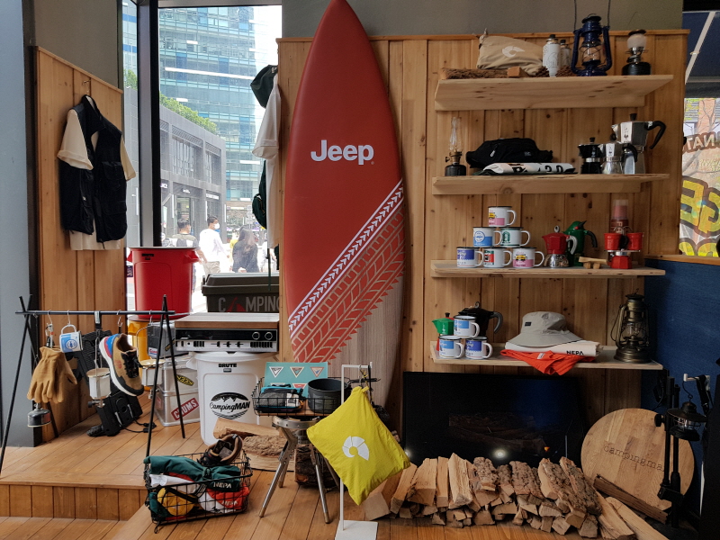 아웃도어 캠핑용품들도 진열되어 있고, 매장 안팎에도 캠핑용 박스 및 테이블과 낮은 의자에서 식사를 할 수 있는 자리를 마련해서 캠핑을 온 거 같은 분위기를 마련하고 있어요.