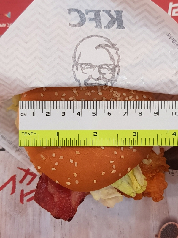 지름은 번을 기준으로 한 것으로, 패티와 베이컨이 양쪽으로 튀어나와있기 때문에 그걸 감안한다면 어림잡아 12~13cm 정도는 되지 않을까 해요.