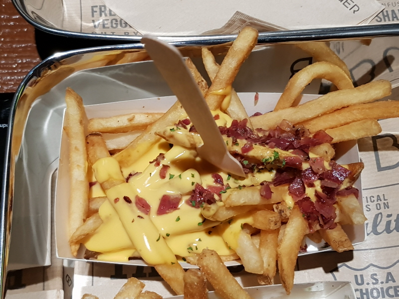 치즈 베이컨 프라이는 프렌치 프라이에 치즈 소스와 베이컨 칩을 뿌려서 나오는 메뉴예요.