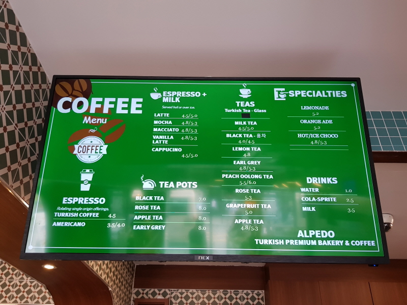 커피와 차 종류가 있고, 터키식 커피나 터키 사과차 (엘마 차이) 도 판매해요.