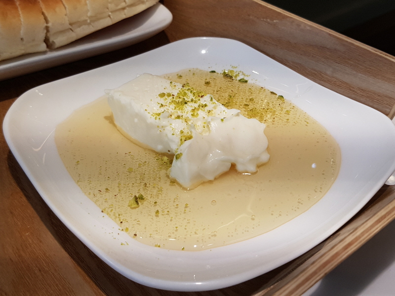 카이막 한 덩어리에 꿀과 피스타치오가루를 뿌려서 나왔어요.