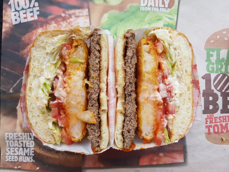 비프 + 새우의 조합도 버거킹 내에서도 여러 번 소개되었던 조합이고, 소스도 기존에 새우버거 종류에 사용하던 소스이다보니 기존의 통새우 와퍼 혹은 아빠상어 새우버거의 업그레이드 버전 정도로 밖에 느껴지지 않아요.