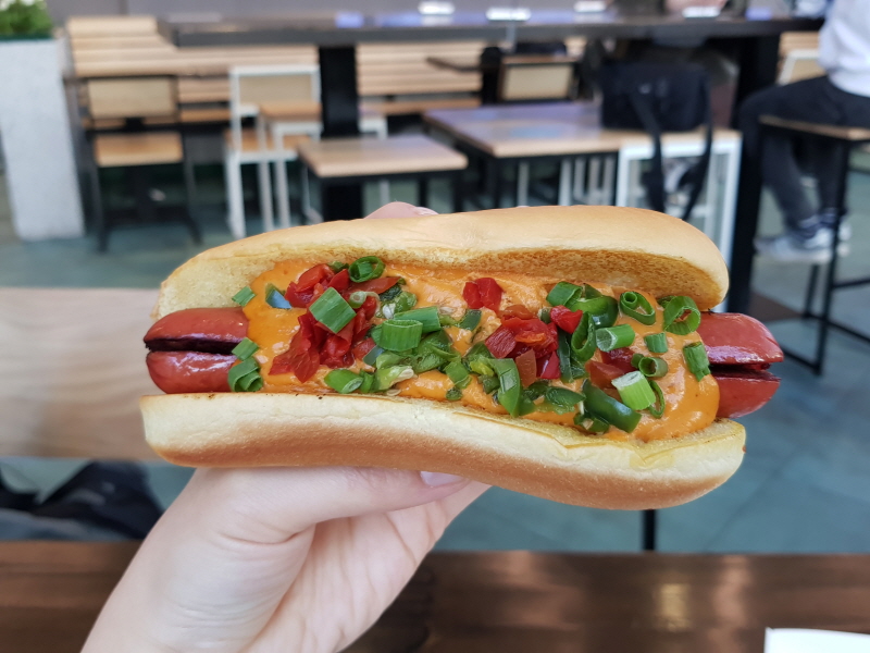 핫도그 빵은 토종 효모가 들어간 포테이토 번으로 버거에 사용하는 것과 동일하지만 핫도그 용으로 모양만 길쭉하게 만드어놓은 것이며, 소시지는 참나무 칩으로 훈연한 비프 소시지라고 해요.