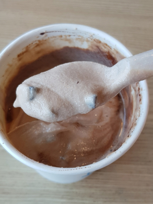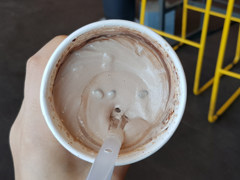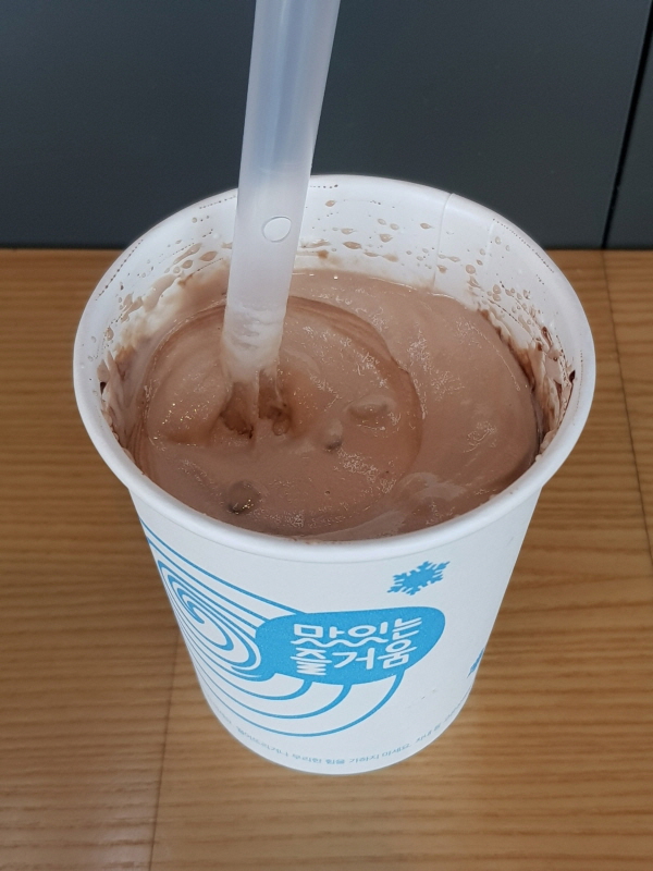 초코향과 색소만 잔뜩 들어간 인공적인 초코맛이 아니라 자판기 코코아나 초코 우유를 그대로 얼려서 소프트 아이스크림을 만든 거 같은 맛이었어요.