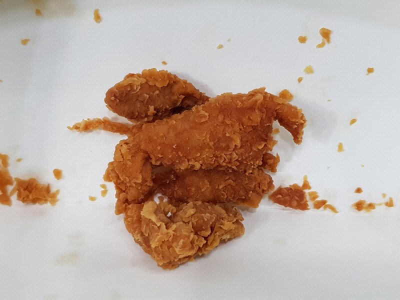 모양이 어떤 건 길쭉하고, 어떤 건 둥글둥글해서 한 입에 넣기 힘들고, 두 입에 나눠먹으면 튀김옷 부스러기들이 떨어지는 게 좀 번거로웠어요.