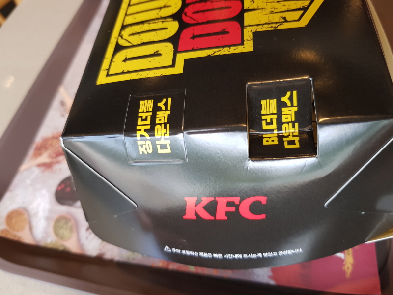 기존의 징거더블다운 맥스와 비교하면 번 역할을 하는 치킨 패티가 징거패티에서 블랙라벨 치킨으로 바뀌었어요.