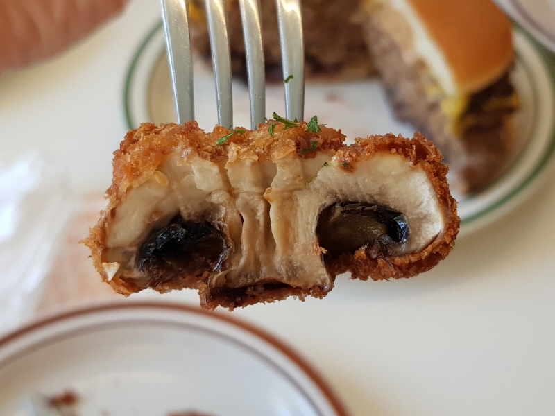 한 입에 넣기는 힘들어서 반으로 잘라먹었더니 튀김옷 안에 갇힌 뜨거운 김이 확 나오면서 양송이 버섯의 풍미가 장난이 아니예요.