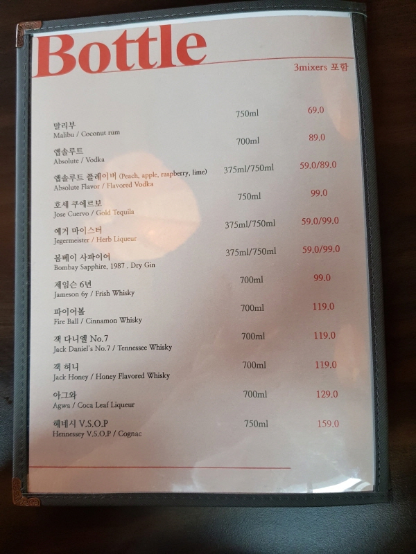양주나 리큐르를 바틀로도 판매하고, 칵테일도 있고, 병맥주도 있어요.