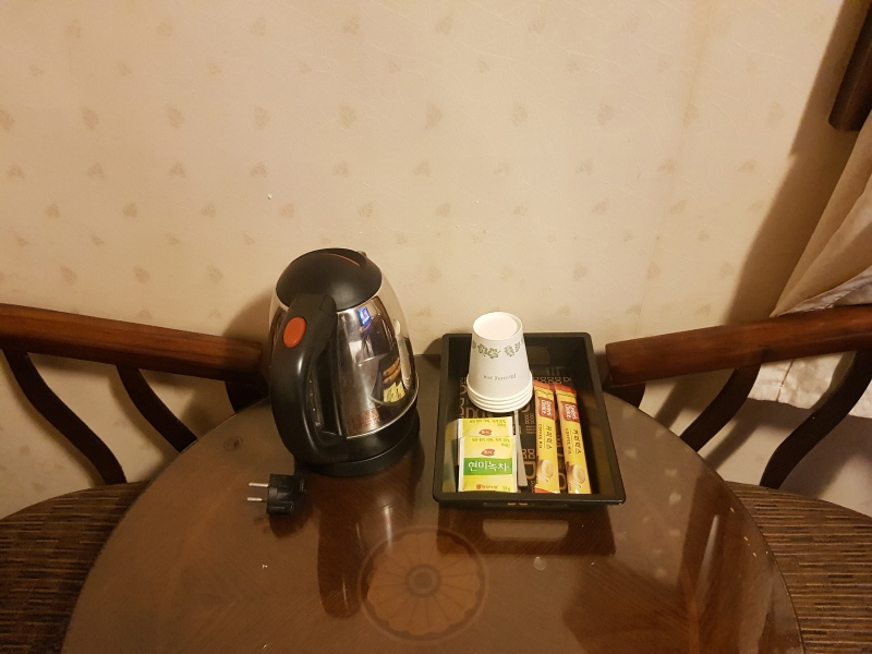침대 옆에는 테이블이 있고, 그 위에는 커피포트와 믹스커피, 녹차, 종이컵이 놓여져있어요.
