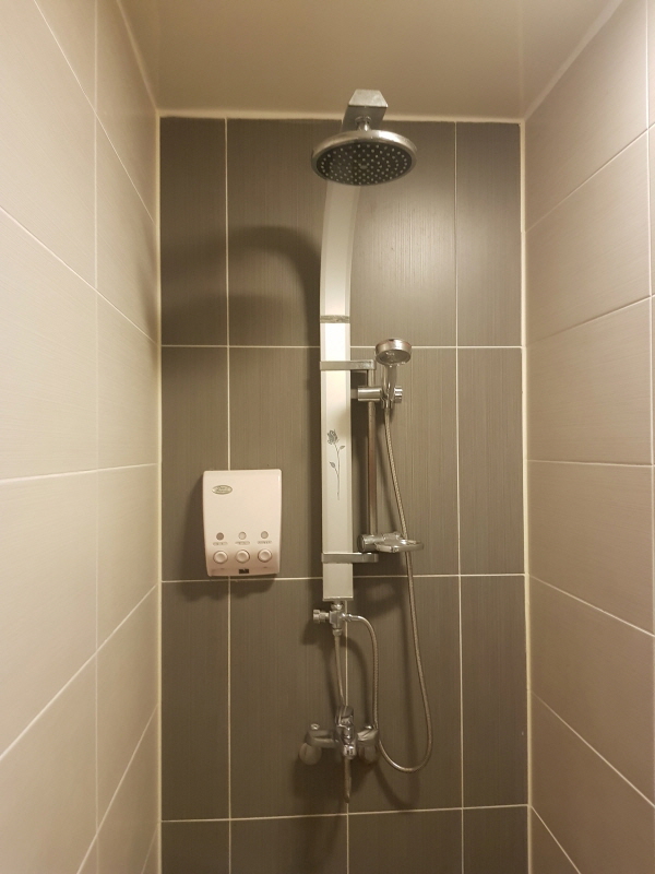 방 넓이의 절반은 될 정도로 넓은 편이라 샤워부스가 없어서 변기 쪽에 물이 튀지 않아요.