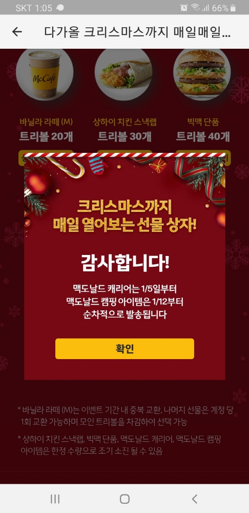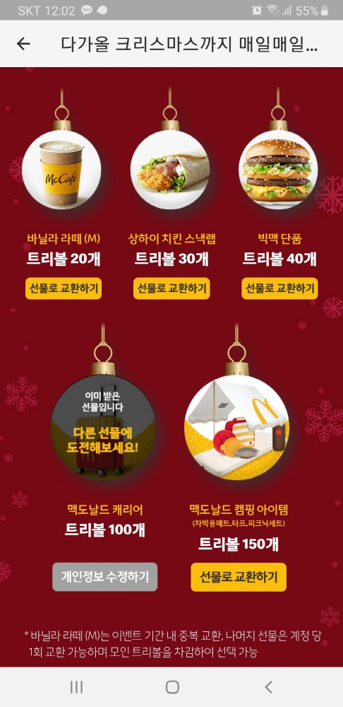 맥도날드에서는 공식 앱에서 크리스마스 이벤트를 진행하고 있어요.