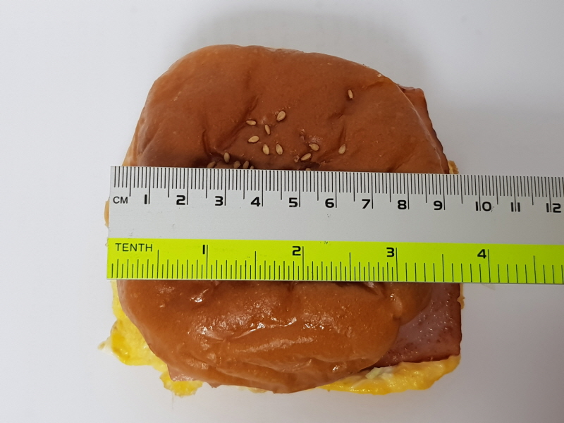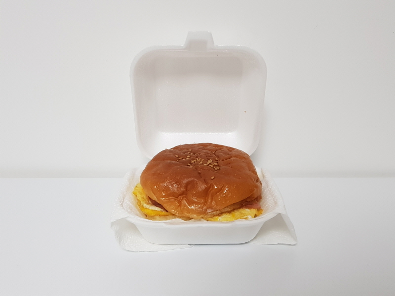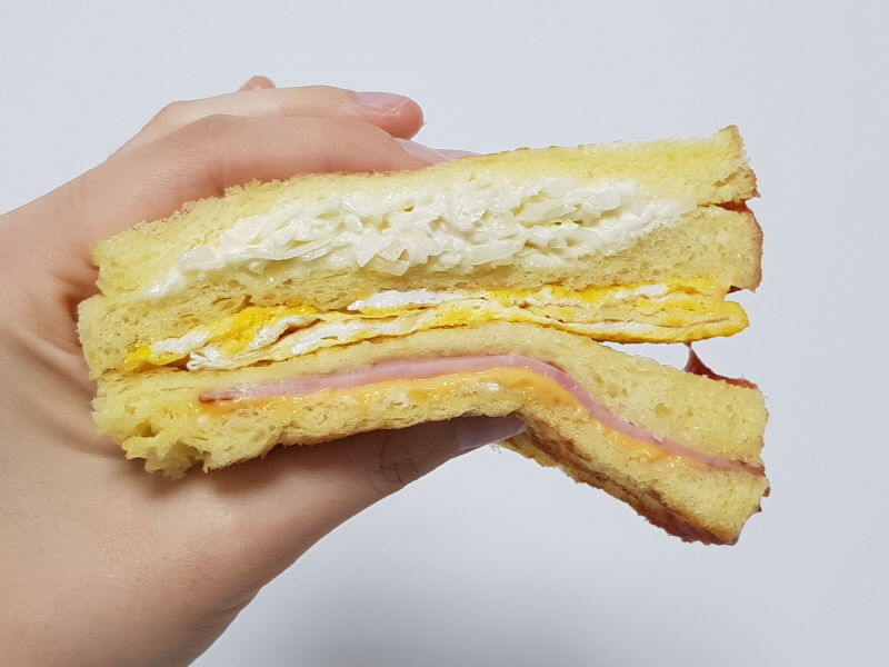 마가린으로 구운 거 같은 식빵에 맨 위에는 양배추를 채썰어서 마요네즈에 으깬 샐러드를, 가운데에는 계란 부침을, 맨 아래에는 슬라이스 치즈와 햄이 들어가요.