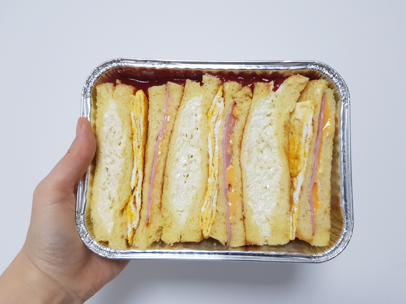 샌드위치라고 하면 알루미늄 호일이나 종이포장지 같은 데 싸줄 줄 알았는데, 일회용 은박 도시락에 담겨서 나와요.