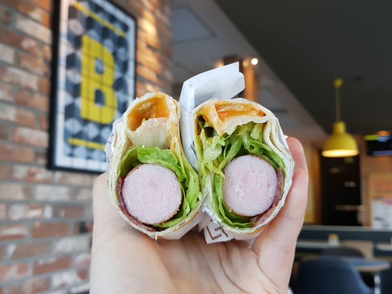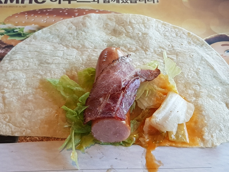 상하이 치킨스낵랩은 치킨텐더를, 비프스낵랩은 저렴이 버거 패티를 넣었는데, 이번에는 소시지가 들어가있는 게 특징이에요.