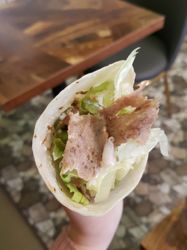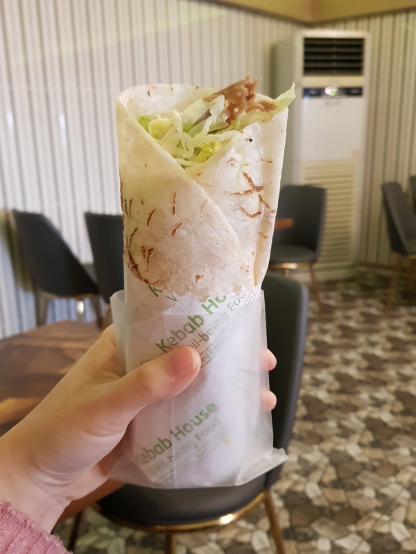 라바쉬 (또띠아) 로 돌돌 감싸져서 있고, 안에는 얇게 자른 양고기와 채썬 양상추, 피클, 양파, 소스 등이 들어있어요.