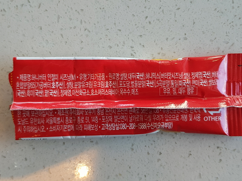 원료는 설탕, 대두, 허니믹스 [버터맛 시즈닝 (설탕, 정제염, 버터혼합분말), 설탕, 분말유크림 (유크림), 포도당, 벌꿀분말], 5곡분말 [통밀, 현미, 쌀보리, 흑미, 팥], 정제염, 이산화규소, 효소처리스테비아, 옥수수, 메조입니다.