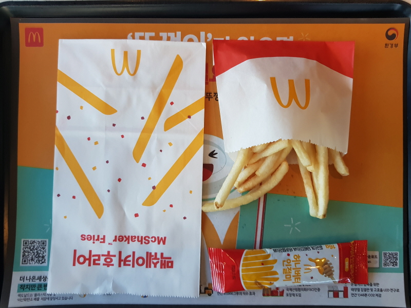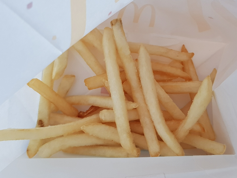 저는 갓 튀긴 프렌치프라이를 바로 받아서 바삭바삭한 상태이고, 딜리버리나 포장으로 약간 물기가 생긴 경우에는 좀 더 나을지도 모르겠어요