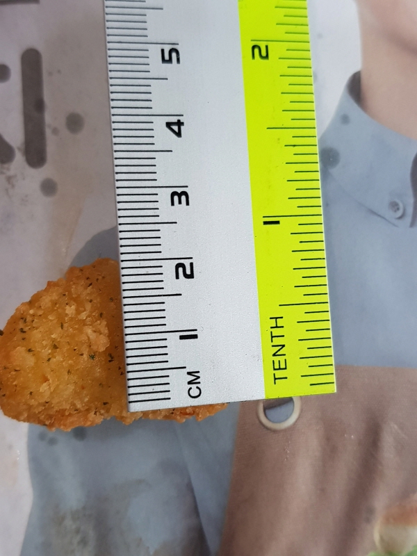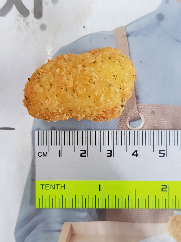 고구마 치즈볼 크기는 약 가로 4cm, 세로 2cm 입니다.