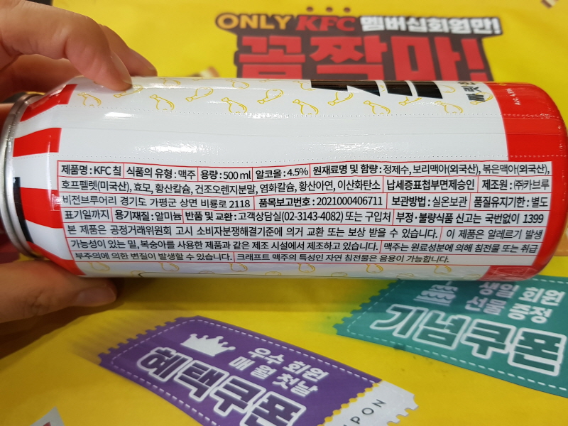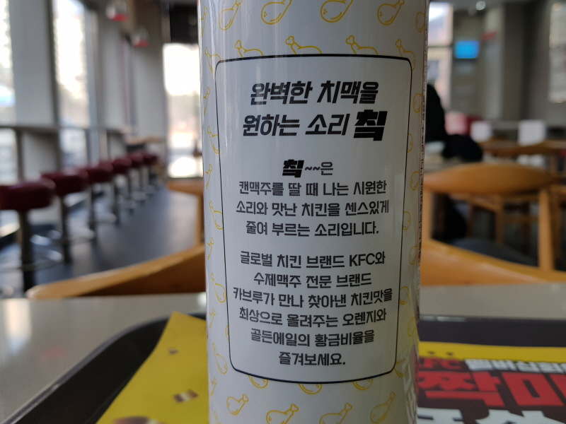 2021년 12월 21일, KFC 에서 칰맥주 라고 하는 캔맥주를 판매하기 시작했어요.