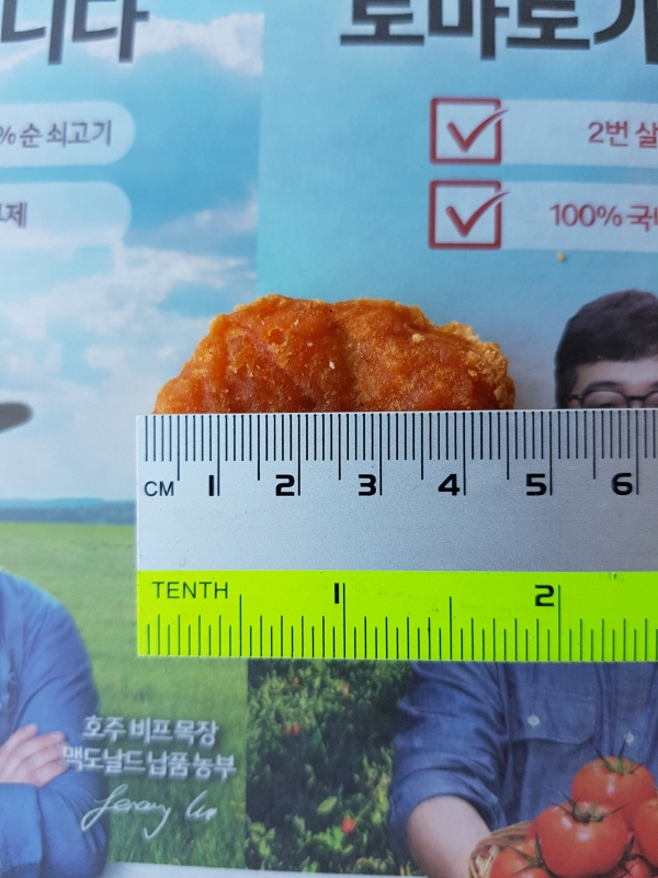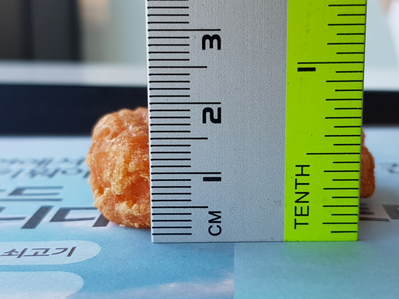 그 중 가장 동그란 모양의 너겟을 골라 재보니 지름이 대략 3.5~ 4.5cm, 높이가 1cm 정도입니다