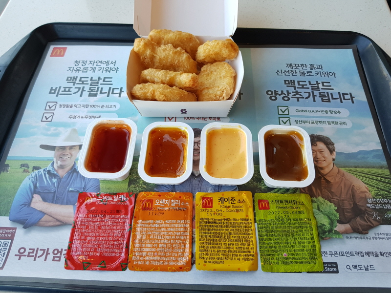현재 맥도날드에서 판매하는 소스는 스위트칠리소스, 오렌지칠리소스, 케이준소스, 스위트앤사워소스, 이렇게 4가지입니다.