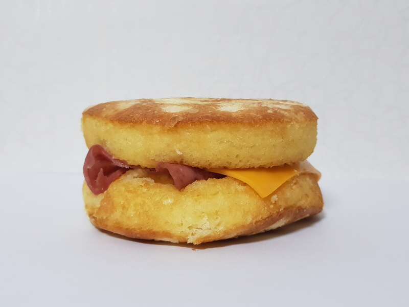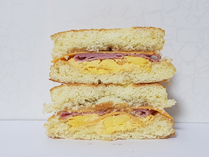 보름달버거는 보름달빵에 슬라이스 햄, 슬라이스 치즈, 스크램블 에그, 소스로 구성되어 있어요.