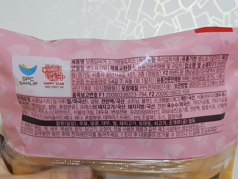 제품명은 보름달버거 스크램블&치즈 이고, 식품유형은 즉석섭취식품입니다.