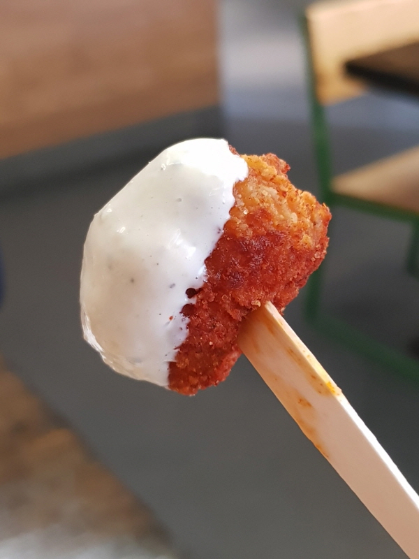 다른 브랜드로 치면 너겟에 해당하는 메뉴인데, 완전히 다진 고기를 반죽해서 튀긴 다른 너겟에 비교해서는 고기의 결이 좀 느껴져요.