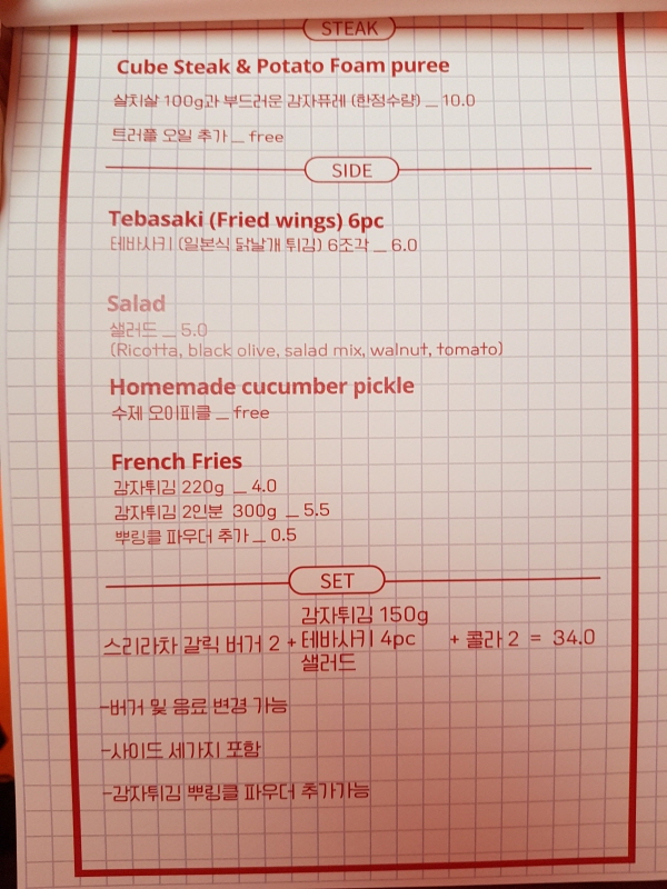 가게 시그니처 메뉴를 추천해달라고 했더니 스리라차 갈릭버거라고 해요.