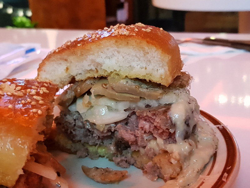 수제버거 중에는 손으로 들고 먹는 스타일도 있고, 썰어먹는 스타일도 있는데, 이 버거는 무조건 썰어먹을 수 밖에 없어요.