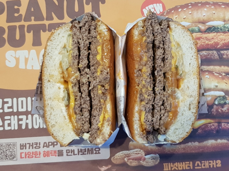 고소한 맛과 들척지근한 맛이 살짝 더해지긴 하지만, 빵 + 고기패티의 맛이 워낙 강하다보니 피넛버터 스태커임에도 불구하고 땅콩버터의 맛이 부각이 안 되요.
