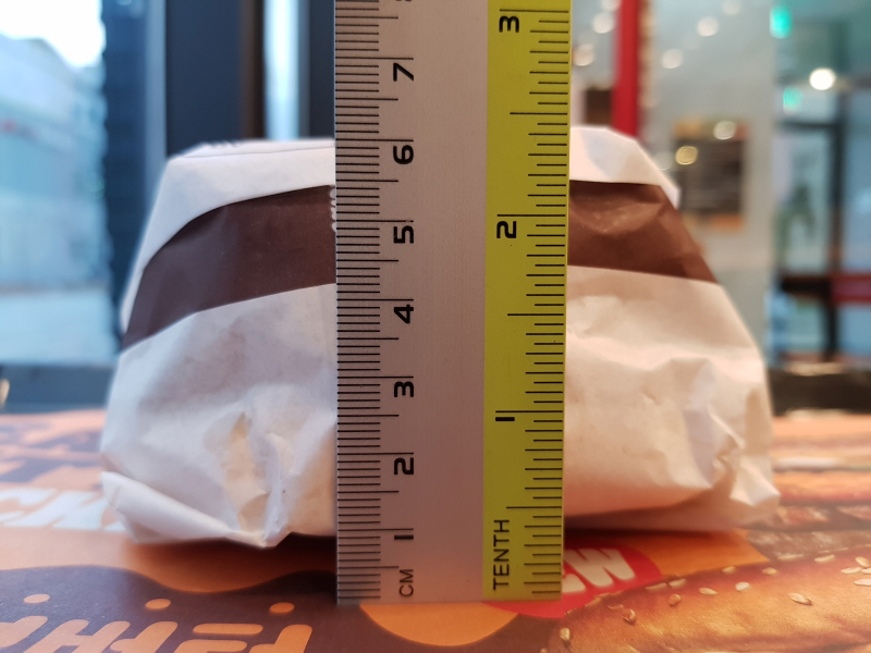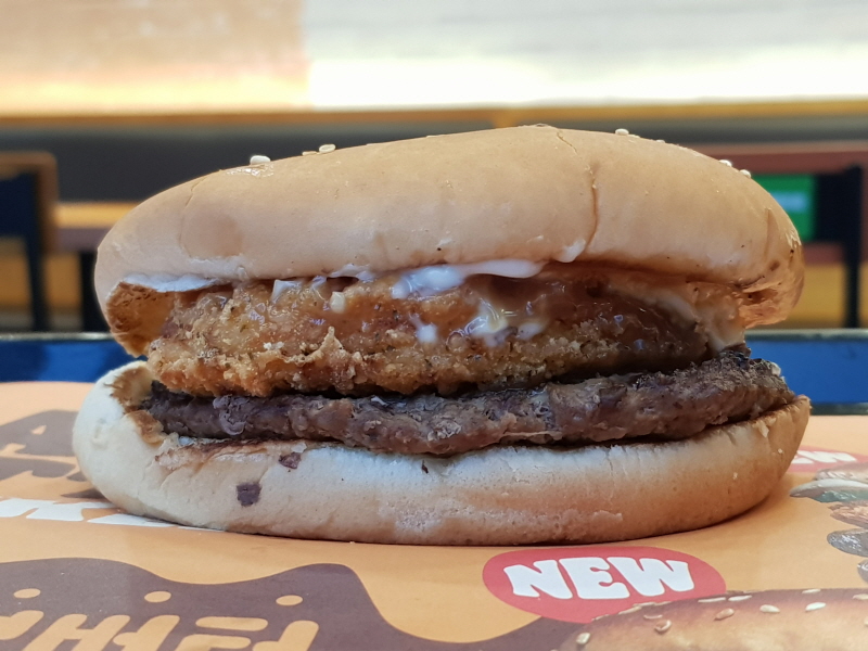 길쭉한 직사각형 모양의 롱치킨패티는 사용할 수 없으니 결국 킹치킨패티를 넣었는데, 육안으로만 봐도 치킨패티가 쇠고기 패티에 비해서 월등히 작아요.